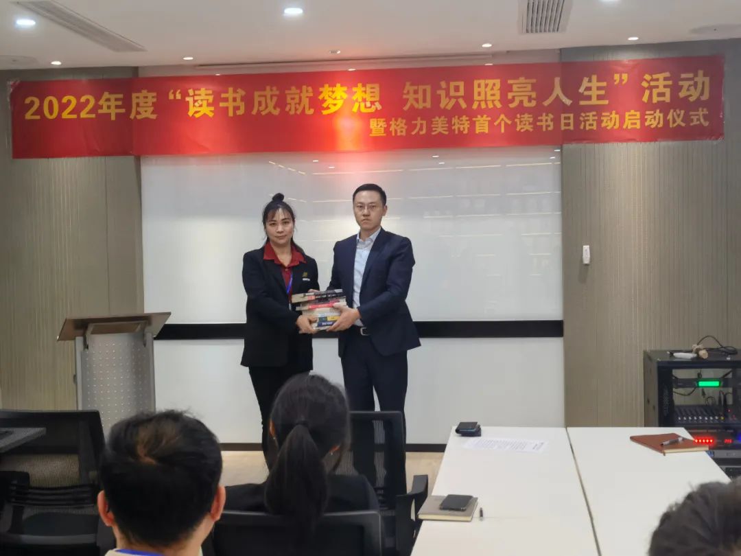 啟動儀式上,公司副董事長金純州先生為格力美特首個“讀書日”活動啟動儀式致辭,并拿出多本自己的珍藏圖書,捐贈給公司圖書館供大家分享、閱讀和學習,運營中心經理姚敏樺代表公司員工上臺受贈,設計中心王昊蘇作為公司職工代表上臺發言。 書是人類進步的階梯,讀書有益于育德、勵志、啟智,公司為讓員工多讀書,讀好書,精心設計建造了一間圖書館,精選了一批精品圖書供大家選擇借閱,種類涉及經濟類、管理類、技術類、勵志類書籍等多種類別,同時還有員工自發的向公司捐贈了一批書籍,便于大家交流分享讀書的喜悅和獲得感。今后公司將不定期舉辦讀書心得分享征文比賽活動,來提高讀書的交流與互動。